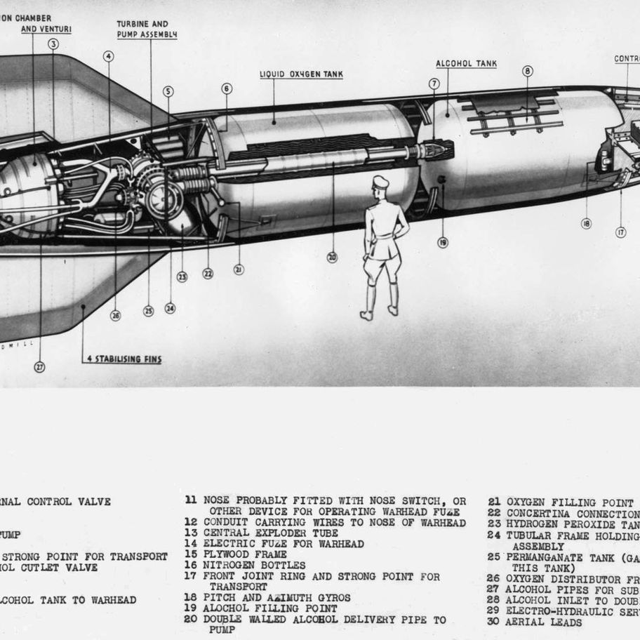 - Included photographs clearly show the V2 rocket's exhaust system, including the placement of these critical components designed to direct the flame, further highlighting the significance of this part.
