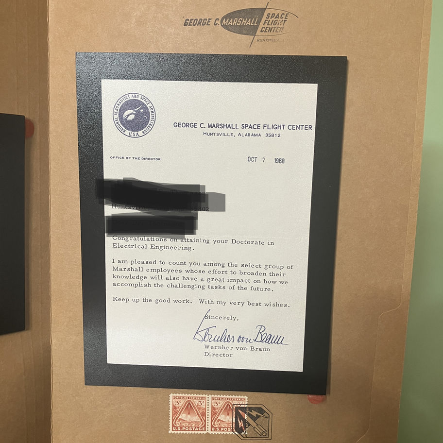 This unparalleled collection celebrates HN-001, a distinguished NASA inventor and George C. Marshall Space Flight Center worker, who collaborated closely with Wernher von Braun. At its heart is an original, personally signed letter from von Braun, commending HN-001’s doctorate in Electrical Engineering—a testament to their invaluable contributions to the Apollo era.